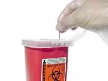 A needlestick injury is the penetration of the skin by a hypodermic needle or other sharp object that has been in contact with blood, tissue or other body fluids before the exposure.[1] Even though the acute physiological effects of a needlestick injury are generally negligible, these injuries can lead to transmission of blood-borne diseases, placing those exposed at increased risk of infection from disease-causing pathogens, such as the hepatitis B virus (HBV), hepatitis C virus (HCV), and human immunodeficiency virus (HIV). Among healthcare workers and laboratory personnel worldwide, more than 25 blood-borne virus infections have been reported to have been caused by needlestick injuries.[2] In addition to needlestick injuries, transmission of these viruses can also occur as a result of contamination of the mucous membranes, such as those of the eyes, with blood or body fluids, but needlestick injuries make up more than 80% of all percutaneous exposure incidents in the United States.[1][3] Various other occupations are also at increased risk of needlestick injury, including law enforcement, laborers, tattoo artists, food preparers, and agricultural workers.[3][4]