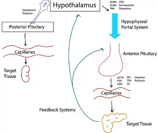 The pituitary gland is divided into three lobes: the anterior pituitary, the intermediate pituitary lobe, and the posterior pituitary. The hypothalamus controls the anterior pituitary's hormone secretion by sending releasing factors, called tropic hormones, down the hypothalamo-hypophysial portal system.[3] For example, thyrotropin-releasing hormone released by the hypothalamus in to the portal system stimulates the secretion of thyroid-stimulating hormone by the anterior pituitary.