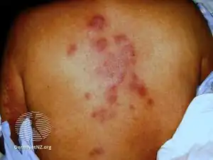 Fever and a non specific skin eruption – with reddening (erythema) and swelling (oedema) of the skin – are the most common symptoms of NEH. Patients usually present with the skin eruption 1-2 weeks after use of the cytotoxic drug. Sometimes, the skin eruption can be painful. Skin eruptions can be located on the extremities, trunk, and face. Severe lesions are rare, and can mimic cellulitis. Generalised lesions resembling erythema multiforme have been reported.[3]