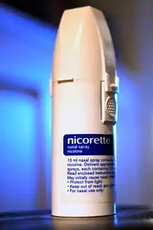 A spray of nicotine is available.[27] Tentative evidence supports that it is better than a placebo.[27] MHRA suggests not to use more than 2 sprays at a time, up to 4 sprays per hour and no more than 64 sprays per 24 hours period.[28]