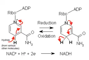 NAD+ acts as an electron carrier that helps with the interconversion of energy between nutrients and the cell's energy currency, adenosine triphosphate (ATP). In oxidation-reduction reactions, the active part of the coenzyme is the nicotinamide. In NAD+, the nitrogen in the aromatic nicotinamide ring is covalently bonded to adenine dinucleotide. The formal charge on the nitrogen is stabilized by the shared electrons of the other carbon atoms in the aromatic ring. When a hydride atom is added onto NAD+ to form NADH, the molecule loses its aromaticity, and therefore a good amount of stability. This higher energy product later releases its energy with the release of a hydride, and in the case of the electron transport chain, it assists in forming adenosine triphosphate.[33]