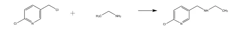 First step, 2-chloro-5-chloromethylpyridine reacts with ethylamine on its phase boundary acquiring the molecule N-ethyl-2-chloro-5-pyridylmethyl amine.