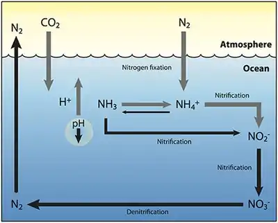 4. 1 2 Voss, M.; Bange, H. W.; Dippner, J. W.; Middelburg, J. J.; Montoya, J. P.; Ward, B. (2013). "The marine nitrogen cycle: recent discoveries, uncertainties and the potential relevance of climate change". Philosophical Transactions of the Royal Society B: Biological Sciences. 368 (1621): 20130121. doi:10.1098/rstb.2013.0121. PMC 3682741. PMID 23713119.