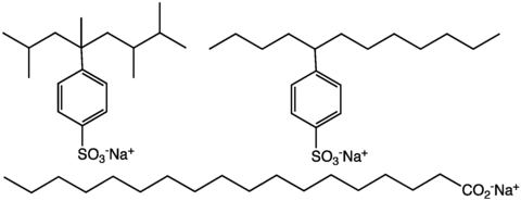 Typical anionic detergents are alkylbenzene sulfonates. The alkylbenzene portion of these anions is lipophilic and the sulfonate is hydrophilic. Two varieties have been popularized, those with branched alkyl groups and those with linear alkyl groups. The former were largely phased out in economically advanced societies because they are poorly biodegradable.[7]