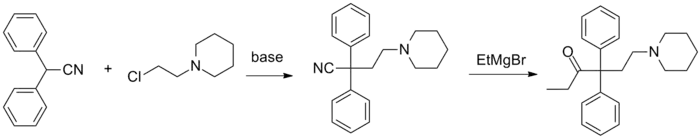 - ↑ Bockmühl M, Ehrhart G (1949). "Über eine neue Klasse von spasmolytisch und analgetisch wirkenden Verbindungen, I". Justus Liebigs Annalen der Chemie. 561: 52–86. doi:10.1002/jlac.19495610107.