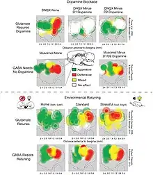 Tuning of appetitive and defensive reactions in the nucleus accumbens shell. (Above) AMPA blockade requires D1 function in order to produce motivated behaviors, regardless of valence, and D2 function to produce defensive behaviors. GABA agonism, on the other hand, does not require dopamine receptor function.(Below)The expansion of the anatomical regions that produce defensive behaviors under stress, and appetitive behaviors in the home environment produced by AMPA antagonism. This flexibility is less evident with GABA agonism.[51]