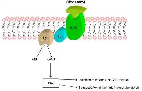 Olodaterol is a nearly full β2 agonist, having 88% intrinsic activity compared to the gold standard isoprenaline/isoproterenol). Its half maximal effective concentration (EC50) is 0.1 nM. It has a higher in vitro selectivity for β2 receptors than the related drugs formoterol and salmeterol: 241-fold versus β1 and 2299-fold versus β3 adrenergic receptors.[10] The high β2/β1 selectivity may account for the apparent lack of tachycardia in clinical trials, which is mediated by β1 receptors on the heart.