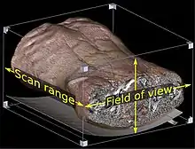 The field of view (FOV) multiplied by scan range creates a volume of voxels (abdominal CT pictured).