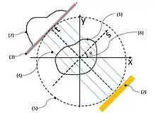 On the other hand, the object (1) will be scanned by CT scanner is fixed to xy coordination system. Hence, object (1) will not be moved while the parallel beam irradiation optical system are rotated around the object (1). The object (1) must be smaller than datum circle.