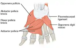 The opponens digiti minimi (opponens digiti quinti in older texts) is a muscle in the hand. It is of a triangular form, and placed immediately beneath the palmaris brevis, abductor digiti minimi and flexor digiti minimi brevis. It is one of the three hypothenar muscles that control the little finger.[1]
