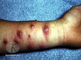 Orf is a viral infection, acquired from other animals.[1] Symptoms are a pus filled bumps of the skin a few centimeters in size; generally, of the hands or forearms.[2][1] A pale halo may forms around the red center and than crust over.[3][4] Onset is about a week after exposure and generally a single lesion occurs.[3] Pain, slight fever, or swollen lymph glands may occur.[3] A few cases are associated with erythema multiforme.[3]