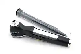 An otoscope or auriscope is a medical device that a doctor or other health care worker uses to look into a patient's ears.[1] Health care providers use otoscopes to screen for illness during regular check-ups and also to investigate ear symptoms.