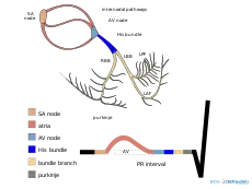 In electrocardiography, the PR interval is the period, measured in milliseconds, that extends from the beginning of the P wave (the onset of atrial depolarization) until the beginning of the QRS complex (the onset of ventricular depolarization); it is normally between 120 and 200 ms in duration. The PR interval is sometimes termed the PQ interval.
