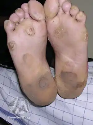 • Pachyonychia congenita type I (also known as "Jadassohn–Lewandowsky syndrome"[10]) is an autosomal dominant keratoderma that principally involves the plantar surfaces, but also with nails changes that may be evident at birth, but more commonly develop within the first few months of life.[9]:510[10][11]:569