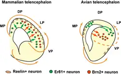 ![]() Schematic illustration of differences in neuronal specification and migration patterns between the mammalian and avian pallium | |
