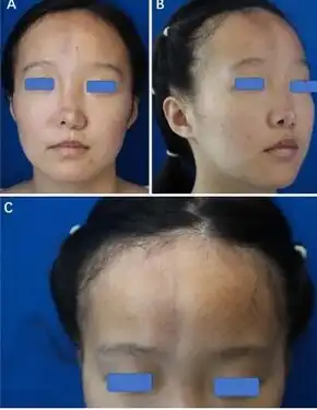 The process may eventually extend to involve tissues between the nose and the upper corner of the lip, the upper jaw, the angle of the mouth, the area around the eye and brow, the ear, and/or the neck.[2][3] The syndrome often begins with a circumscribed patch of scleroderma in the frontal region of the scalp which is associated with a loss of hair and the appearance of a depressed linear scar extending down through the midface on the affected side. This scar is referred to as a "coup de sabre" lesion because it resembles the scar of a wound made by a sabre, and is indistinguishable from the scar observed in frontal linear scleroderma.[4][5]