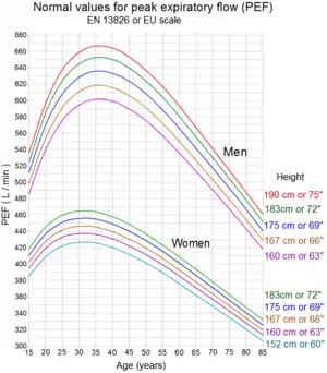 To interpret the significance of peak expiratory flow measurements, a comparison is made to reference (normal, predicted) values based on measurements taken from the general population. Various reference values have been published in the literature and vary by population, ethnic group, age, sex, height and weight of the patient. For this reason, tables or charts are used to determine the normal value for a particular individual. More recently, medical calculators have been developed to calculate predicted values for peak expiratory flow. There are a number of non-equivalent scales used in the interpretation of peak expiratory flow.[4]