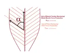 A pennate or pinnate muscle (also called a penniform muscle) is a type of skeletal muscle with fascicles that attach obliquely (in a slanting position) to its tendon. This type of muscle generally allows higher force production but a smaller range of motion.[1][2] When a muscle contracts and shortens, the pennation angle increases.[3]