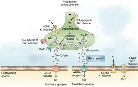 - ↑ Rogawski MA (March 2011). "Revisiting AMPA receptors as an antiepileptic drug target". Epilepsy Currents. 11 (2): 56–63. doi:10.5698/1535-7511-11.2.56. PMC 3117497. PMID 21686307. S2CID 15246804.