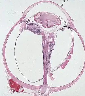 Persistent hyperplastic primary vitreous (PHPV), also known as persistent fetal vasculature (PFV), is a rare congenital developmental anomaly of the eye that results following failure of the embryological, primary vitreous and hyaloid vasculature to regress.[1] It can be present in three forms: purely anterior (persistent tunica vasculosa lentis and persistent posterior fetal fibrovascular sheath of the lens), purely posterior (falciform retinal septum and ablatio falcicormis congenita) and a combination of both.[1] Most examples of PHPV are unilateral and non-hereditary. When bilateral, PHPV may follow an autosomal recessive or autosomal dominant inheritance pattern.