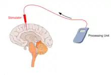 Deep brain stimulation is a surgical technique used to alleviate patients from phantom limb pain. It is typically reserved for refractory cases or when all other therapeutic interventions have not provided relief. Prior to surgery, patients undergo functional brain imaging techniques such as PET scans and functional MRI to determine an appropriate trajectory of where pain is originating.[49] Surgery is then carried out under local anesthetic, because patient feedback during the operation is needed. In the study conducted by Bittar et al., a radiofrequency electrode with four contact points was placed on the brain. Once the electrode was in place, the contact locations were altered slightly according to where the patient felt the greatest relief from pain. Once the location of maximal relief was determined, the electrode was implanted and secured to the skull. After the primary surgery, a secondary surgery under general anesthesia was conducted. A subcutaneous pulse generator was implanted into a pectoral pocket below the clavicle to stimulate the electrode.[8] It was found that all three patients studied had gained satisfactory pain relief from the deep brain stimulation. Pain had not been completely eliminated, but the intensity had been reduced by over 50% and the burning component had completely vanished.[8] Additional studies have corroborated these findings, though more rigorous interventional trials are needed to better elucidate the safety and efficacy of this procedure.[50][51] A recent systematic review found mixed results, also suggesting the need for additional randomized, controlled studies.[49]