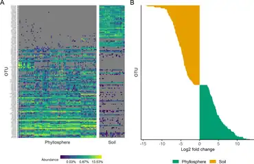 (B) The chart on the right shows how OTUs in phyllosphere and associated soil communities differed in relative abundances.[55]