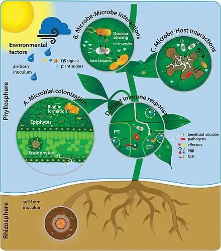 Interactions between plants and their associated microorganisms in many of these microbiomes can play pivotal roles in host plant health, function, and evolution.[48] The leaf surface, or phyllosphere, harbours a microbiome comprising diverse communities of bacteria, fungi, algae, archaea, and viruses.[49][50] Interactions between the host plant and phyllosphere bacteria have the potential to drive various aspects of host plant physiology.[51][52][53] However, as of 2020 knowledge of these bacterial associations in the phyllosphere remains relatively modest, and there is a need to advance fundamental knowledge of phyllosphere microbiome dynamics.[54][55]