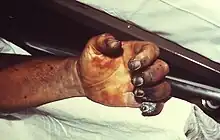 - ↑ Bos, Kirsten; Schuenemann, Verena J.; Golding, G. Brian; Burbano, Hernán A.; Waglechner, Nicholas; Coombes, Brian K.; McPhee, Joseph B.; Dewitte, Sharon N.; Meyer, Matthias; Schmedes, Sarah; Wood, James; Earn, David J. D.; Herring, D. Ann; Bauer, Peter; Poinar, Hendrik N.; Krause, Johannes (12 October 2011). "A draft genome of Yersinia pestis from victims of the Black Death". Nature. 478 (7370): 506–510. Bibcode:2011Natur.478..506B. doi:10.1038/nature10549. PMC 3690193. PMID 21993626.