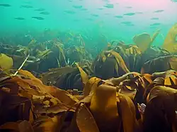 Kelp forests dominate the rocky coastlines of temperature regions, and provide habitat, shelter, and food for many organisms, including the Planctomycetota.[5] Given the considerable role of kelp forests in coastal primary productivity, the association of the Planctomycetota with kelp could indicate their significant role in coastal habitats.[44] Planctomycetota also play an important role as components of detritus in the water column, also known as marine snow,[5][44] given their ability to attach to surfaces.[45]