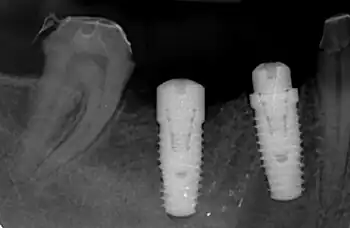 Because of this established mean horizontal dimension of the immediate crestal bone loss around dental implants, an issue arises when implants are placed into adjacent sites in the mouth. If the implants are placed too closely together, the overlap of the horizontal components of each implant's biologic width serves to increase the effective vertical crestal bone loss between the implants.[10] This was first reported by Dennis Tarnow et al. in 2000 in a study that demonstrated that the distance between the most coronal aspect of the inter-implant bone and an imaginary line drawn between the implant platforms was greater when adjacent implants were placed ≤3 mm apart.