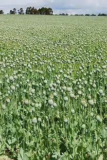 Poppy straw (also known as opium straw, mowed opium straw, crushed poppy capsule, poppy chaff, or poppy husk) is derived from opium poppies (Papaver somniferum) that are harvested when fully mature and dried by mechanical means. Opium poppy straw is what remains after the seed pods have been harvested - that is, the dried stalks, stem and leaves of poppies grown for their seeds.[1] The field-dried leaves, stalk, and seed pod are then used in commercial manufacture of morphine or other poppy-alkaloid derived drugs, by first processing the material, separating the seeds, and then making concentrate of poppy straw[2] where no extraction using the traditional methods of latex extraction has been made.[3] The straw was originally considered an agricultural by-product of the mechanised poppy seed harvest, which was primarily grown for its edible and oil-producing seed. This changed in 1927 when János Kabay developed a chemical process to extract morphine from the crushed capsule.[2] Concentrated poppy straw, consisting mainly of the crushed capsule without the seeds,[4] soon became a valuable source of morphine. Today, concentrate of poppy straw is a major source of many opiates and other alkaloids. It is the source of 90% of the world supply of legal morphine (for medical and scientific use)[5] and in some countries it also is a source of illegal morphine, which could be processed into illegal heroin.[4]