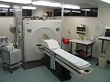 ![]() A PET-CT scanner, with hanging pump for contrast CT |