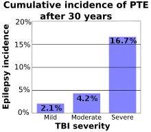 The more severe the brain trauma is, the more likely a person is to have late PTE.[19] Evidence suggests that mild head injuries do not confer an increased risk of developing PTE, while more severe types do.[20] In simple mild TBI, the risk for PTE is about 1.5 times that of the uninjured population.[18] By some estimates, as many as half of individuals with severe brain trauma experience PTE;[19] other estimates place the risk at 5% for all TBI patients and 15–20% for severe TBI.[21] One study found that the 30-year risk of developing PTE was 2.1% for mild TBI, 4.2% for moderate, and 16.7% for severe injuries, as shown in the chart at right.[18][22]