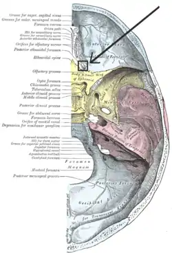Base of the skull. Upper surface. (On the left, "Posterior ethmoidal foramen" is the 9thlabel from the right.