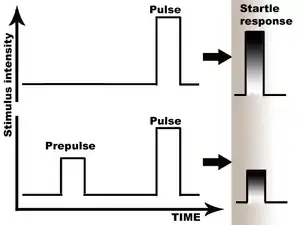 Another moderating variable in prepulse inhibition and facilitation is sex difference, with men having higher PPI (i.e., when a prepulse is quickly followed by a pulse, all subjects tend to experience a reduced startle response, with men often experiencing lesser startle responses compared to women) and women having higher PPF (i.e., when the prepulse occurs more than half a second before the pulse, all subjects tend to experience heightened startle responses, with women tending to experience greater startle responses than men).[12] For acoustic stimuli, monaural PPI is higher than binaural—the startle response is reduced when the stimulus (noise) is only experienced in one ear rather than both ears.[13][14] Even the very first prepulse of a test session induces inhibition, which indicates that conditioning and learning are not necessary for this effect to occur. However, the lack of conditionality has been questioned.[15] However a thousandth prepulse also induces inhibition; the phenomenon is highly robust [16]