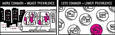 In epidemiology, prevalence is the proportion of a particular population found to be affected by a medical condition (typically a disease or a risk factor such as smoking or seatbelt use) at a specific time.[1] It is derived by comparing the number of people found to have the condition with the total number of people studied and is usually expressed as a fraction, a percentage, or the number of cases per 10,000 or 100,000 people. Prevalence is most often used in questionnaire studies.