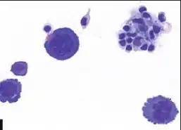 In classical cavitary cases, the diagnosis of PEL may be suspected based on its presentation as effusions in one or more bodily cavities in individuals with a history of the immunodeficiencies cited above. The diagnosis is supported by microscopic examination of cytologic smears taken from these effusions. These smears typically show plasmablasts and, in some cases, other malignant cells that have the morphology of anaplastic cells (i.e., large pleomorphic cells) or the Reed-Sternberg cells associated with Hodgkin disease.[1] As detected by immunostaining methods, the malignant cells typically express molecular marker proteins such as CD45 (which is not expressed on mature plasma cells) as well as activation and plasma cell marker proteins such as CD30, MUC1, CD38, syndecan 1, and IRF4/MUM1; they do not express B-cell molecular marker proteins such as PAX5, CD19, CD29, or CD79a. The cells may also express many of the structural and non-structural gene abnormalities cited in the Pathophysiology section.[1] By definition, individuals with PEL are infected by Kaposi's sarcoma-associated herpesvirus (HHV-8 or KSHV/HHV8)[13][14] and therefore evidence malignant cells that express products of this virus such as LANA1.[1] In most cases, these individuals are also infected with EBV[15] and therefore evidence malignant cells that express products of this virus such as EBER1/2 nuclear RNA's.[1] Cases associated with HIV/AIDS test positive for antibodies directed against this virus.[1] (PEL occurs in the absence of HHV-8 and HIV, although this is rare.[16]) Individuals with PEL that is associated with cirrosis due to hepatitis evidence positive serum tests for the hepatitis virus B antigen (HBsAg) or one of the various tests for hepatitis C antigen.[5] Extracavitary PEL is diagnosed based on findings that their mass lesions contain the same or very similar types of malignant cells and the same set of blood and serum findings as those that are found in cavitary PEL.[3]