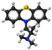Promethazine, a phenothiazine derivative, is structurally different from the neuroleptic phenothiazines, with similar but different effects.[5] It acts primarily as a strong antagonist of the H1 receptor (antihistamine) and a moderate mACh receptor antagonist (anticholinergic),[5] and also has weak to moderate affinity for the 5-HT2A,[20] 5-HT2C,[20] D2,[21][22] and α1-adrenergic receptors,[23] where it acts as an antagonist at all sites, as well.