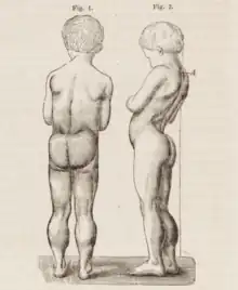 | Drawing of seven-year-old boy with Duchenne muscular dystrophy. There is pseudohypertrophy of the lower limbs. | |