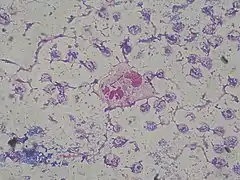 Depending on the nature of infection, an appropriate specimen is collected and sent to a bacteriology laboratory for identification. As with most bacteriological specimens, a Gram stain is performed, which may show Gram-negative rods and/or white blood cells. P. aeruginosa produces colonies with a characteristic "grape-like" or "fresh-tortilla" odor on bacteriological media. In mixed cultures, it can be isolated as clear colonies on MacConkey agar (as it does not ferment lactose) which will test positive for oxidase. Confirmatory tests include production of the blue-green pigment pyocyanin on cetrimide agar and growth at 42 °C. A TSI slant is often used to distinguish nonfermenting Pseudomonas species from enteric pathogens in faecal specimens.