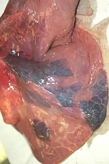 Lung infarction occurs when an artery to the lung becomes blocked and part of the lung dies.[1] It is most often caused by pulmonary embolism.