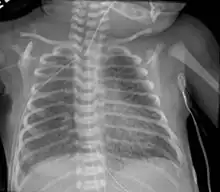 | Chest radiography showing severe pulmonary interstitial emphysema | |