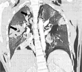 | Coronal CT scan showing lucencies (pale areas in radiography) in the lung caused by pulmonary lacerations on the left of the image (black arrows) | |