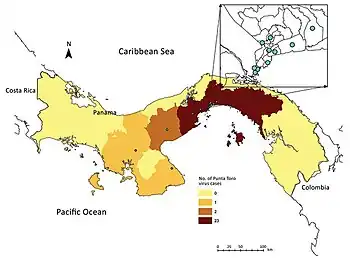 The Punta Toro virus is a member of the genus Phlebovirus of the order Bunyavirales. It was initially isolated from patients in Colombia and two key patients in Panama. Two individual serotypes of PTV were isolated from these patients, PTV-Adames (A) and PTV-Balliet (B), with PTV-A appearing to be more virulent. PTV is considered to be relatively contained to the Americas with no cases being reported outside of this region. Along with a few other human pathogenic Phleboviruses, PTV is considered to be a significant virus in terms of public health as little information is known about its clinical effects and with further research underway, PTV could have unforeseen impacts on health and virology.[1]