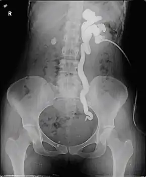 A retrograde pyelogram is a medical imaging procedure in which a radiocontrast agent is injected into the ureter in order to visualize the ureter, bladder, and kidneys with fluoroscopy or radiography, using plain X-rays.[13] The flow of contrast (up from the bladder to the kidney) is opposite the usual outbound flow of urine, hence the retrograde ("moving backwards") name.