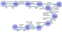 In cases where PDCD is a result of a mutation in a gene other than PDHA1, it is most commonly known to be due to mutations in the following six genes, PDHB, DLAT, PDHX, PDP1, DLD, and LIAS.[14][15] All of these genes, like the PDHA1 gene are responsible for coding for a specific subunit of the pyruvate dehydrogenase complex. The PDHB gene is responsible for the coding of the E1 beta subunit of the pyruvate dehydrogenase complex. The DLAT gene is responsible for the coding of the E2 subunit, and the PDP1 is responsible for producing the PDH phosphatase catalytic subunit that catalyzes PDH dephosphorylation. This dephosphorylation activates the complex. The final gene that could be responsible for this disease is the PDHX gene, which codes for the E3 binding protein which is responsible for binding E3 dimers to the E2 subunit of the complex.[16] The DLD gene is responsible for encoding dihydrolipoamide dehydrogenase, a flavoprotein component known as E3, required by the pyruvate dehydrogenase complex.[15] The LIAS gene is responsible for synthesizing lipoic acid, a cofactor required by the pyruvate dehydrogenase complex.[15]