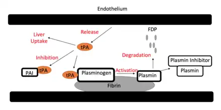 In vivo mechanism of action of tPA within the fibrinolytic system. tPA can go one of three ways in the body; (1) uptaken by the liver and cleared through receptors therein, (2) inhibited by a plasminogen activator inhibitor (PAI) and subsequently cleared from the liver, or (3) through the activation of plasminogen to plasmin for degradation to result in fibrin degradation product (FDP).[36][37]