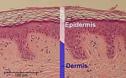 The epidermis is the outermost of the three layers that comprise the skin, the inner layers being the dermis and hypodermis.[1] The epidermis layer provides a barrier to infection from environmental pathogens[2] and regulates the amount of water released from the body into the atmosphere through transepidermal water loss.[3]