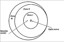 The zones are centered on the optic nerve. Zone I is the posterior zone of the retina, defined as the circle with a radius extending from the optic nerve to double the distance to the macula. Zone II is an annulus with the inner border defined by zone I and the outer border defined by the radius defined as the distance from the optic nerve to the nasal ora serrata. Zone III is the residual temporal crescent of the retina.