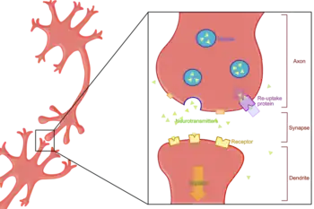 The main objective of a reuptake inhibitor is to substantially decrease the rate by which neurotransmitters are reabsorbed into the presynaptic neuron, increasing the concentration of neurotransmitter in the synapse. This increases neurotransmitter binding to pre- and postsynaptic neurotransmitter receptors. Depending on the neuronal system in question, a reuptake inhibitor can have drastic effects on cognition and behavior. Non-competitive inhibition of the bacterial homologue LeuT by tricyclic antidepressants resulted from binding of these inhibitors in the extracellular permeation pathway.[9][10] However, the competitive nature of serotonin transport inhibition by antidepressants suggests that in neurotransmitter transporters, they bind in a site overlapping the substrate site.[11]